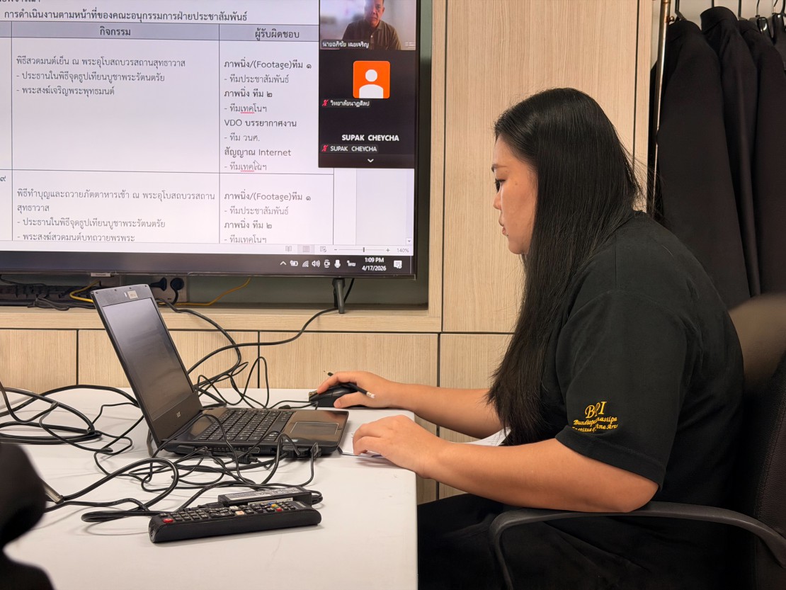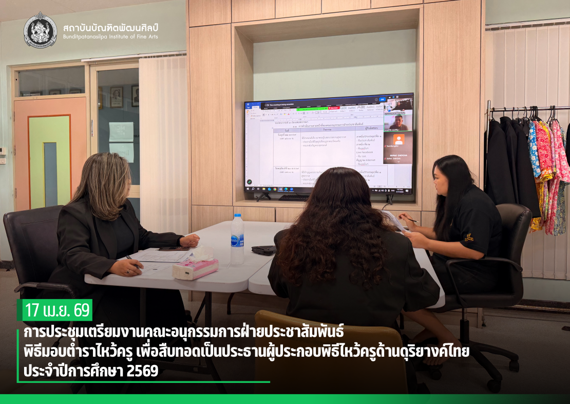 วันนี้ (17 เมษายน 2569) ดร.สุชาดา โสวัตร ผู้ช่วยอธิการบดีสถาบันบัณฑิตพัฒนศิลป์ เป็นประธานการประชุมเตรียมงานคณะอนุกรรมการฝ่ายประชาสัมพันธ์ พิธีมอบตำราไหว้ครู เพื่อสืบทอดเป็นประธานผู้ประกอบพิธีไหว้ครูด้านดุริยางค์ไทย ประจำปีการศึกษา 2569 เพื่อวางแผนการดำเนินงานด้านการประชาสัมพันธ์ และการเผยแพร่ข้อมูลข่าวสารของพิธีดังกล่าวให้เป็นไปอย่างถูกต้อง ครบถ้วน และมีประสิทธิภาพ ณ ฝ่ายเผยแพร่และประชาสัมพันธ์ ชั้น 11 อาคารคณะศิลปนาฏดุริยางค์ สถาบันบัณฑิตพัฒนศิลป์ (ศาลายา) และผ่านระบบออนไลน์ Zoom Meeting