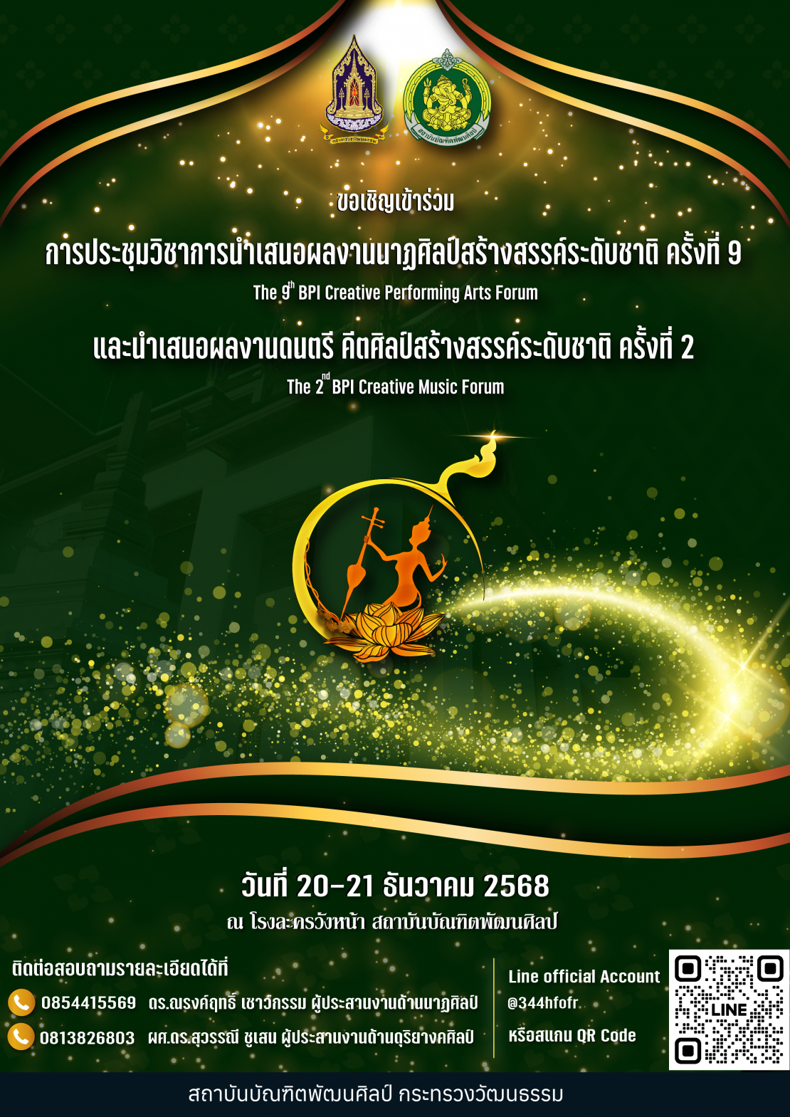 ในวันที่ 20 และ 21 ธันวาคม 2568 ในรูปแบบ Onsite ณ โรงละครวังหน้า สถาบันบัณฑิตพัฒนศิลป์