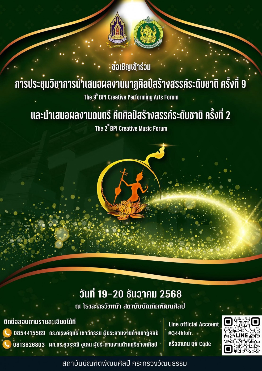 สบศ.ขอเชิญเข้าร่วมงานประชุมวิชาการ "การนำเสนอผลงานนาฏศิลป์สร้างสรรค์ระดับชาติ ครั้งที่ 9 และ การนำเสนองานดนตรีสร้างสรรค์ ครั้งที่ 2