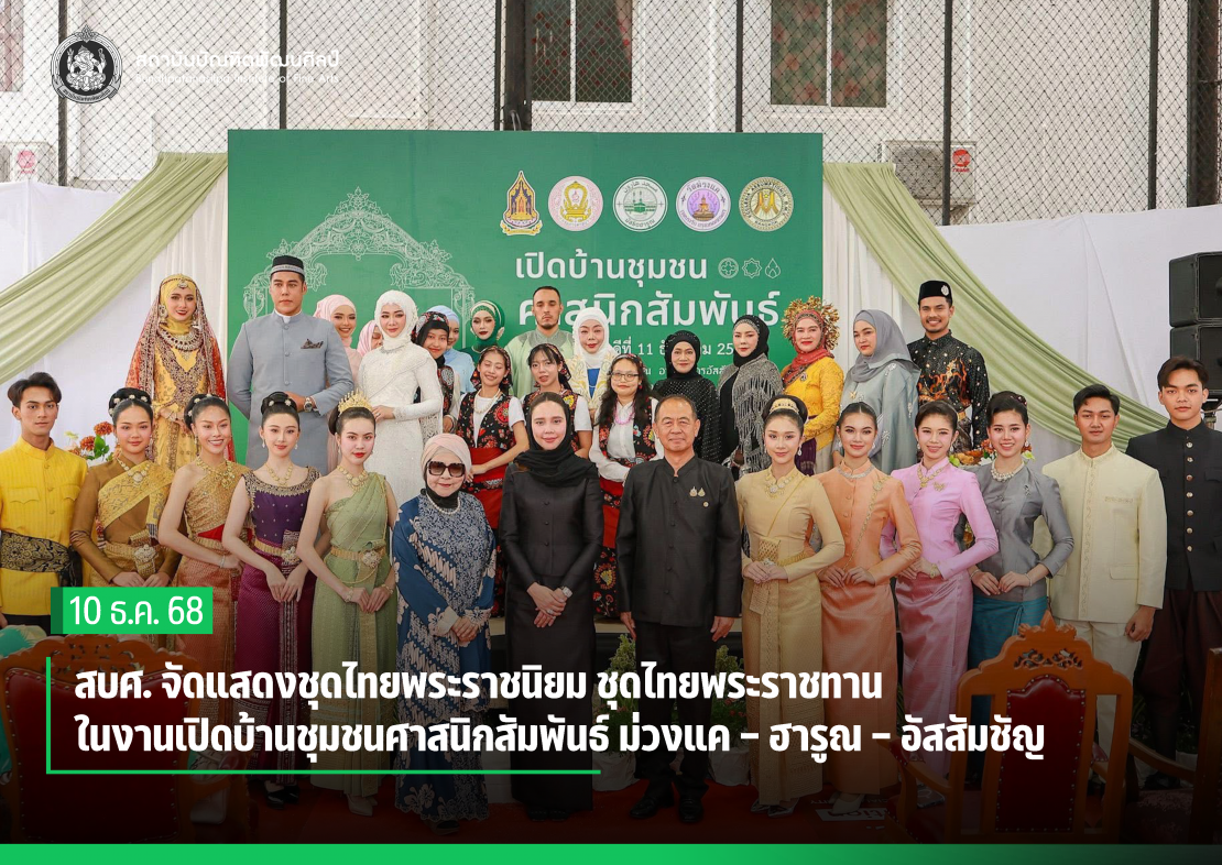 วันนี้ (11 ธันวาคม 2568) เวลา 11.00 น. สถาบันบัณฑิตพัฒนศิลป์ โดย ผู้ช่วยศาสตราจารย์ ดร.พหลยุทธ กนิษฐบุตร รองอธิการบดี นำนักศึกษาคณะศิลปนาฏดุริยางค์ แต่งกายใน ชุดไทยพระราชนิยม 8 แบบ สำหรับสุภาพสตรี และ ชุดไทยพระราชทาน 3 แบบ สำหรับสุภาพบุรุษ ร่วมจัดแสดงในงานเปิดบ้านชุมชนศาสนิกสัมพันธ์ ม่วงแค - ฮารูณ – อัสสัมชัญ ตามที่กรมศาสนา กระทรวงวัฒนธรรม ขอความอนุเคราะห์ โดยมี นางสาวซาบีดา ไทยเศรษฐ์ รัฐมนตรีว่าการกระทรวงวัฒนธรรม เป็นประธานในพิธี ณ มัสยิดฮารูณ เขตบางรัก กรุงเทพมหานคร