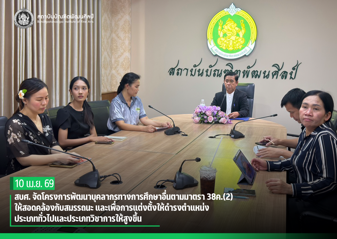 สถาบันบัณฑิตพัฒนศิลป์ จัดโครงการพัฒนาบุคลากรทางการศึกษาอื่นตามมาตรา 38ค.(2) ให้สอดคล้องกับสมรรถนะ และเพื่อการแต่งตั้งให้ดำรงตำแหน่ง ประเภททั่วไปและประเภทวิชาการให้สูงขึ้น โดยมี ผู้ช่วยศาสตราจารย์ ดร.สมเกียรติ ภูมิภักดิ์  อธิการบดี เป็นประธานเปิดโครงการ ผู้ช่วยศาสตราจารย์อำนวย นวลอนงค์ รองอธิการบดี กล่าวรายงาน พร้อมด้วย ข้าราชการครูและบุคลากรทางการศึกษา ตำแหน่งบุคลากรทางการศึกษาอื่น ตามมาตรา 38 ค.(2) เข้าร่วม ในวันที่ 10 เมษายน 2569 ผ่านระบบออนไลน์ Zoom Meeting