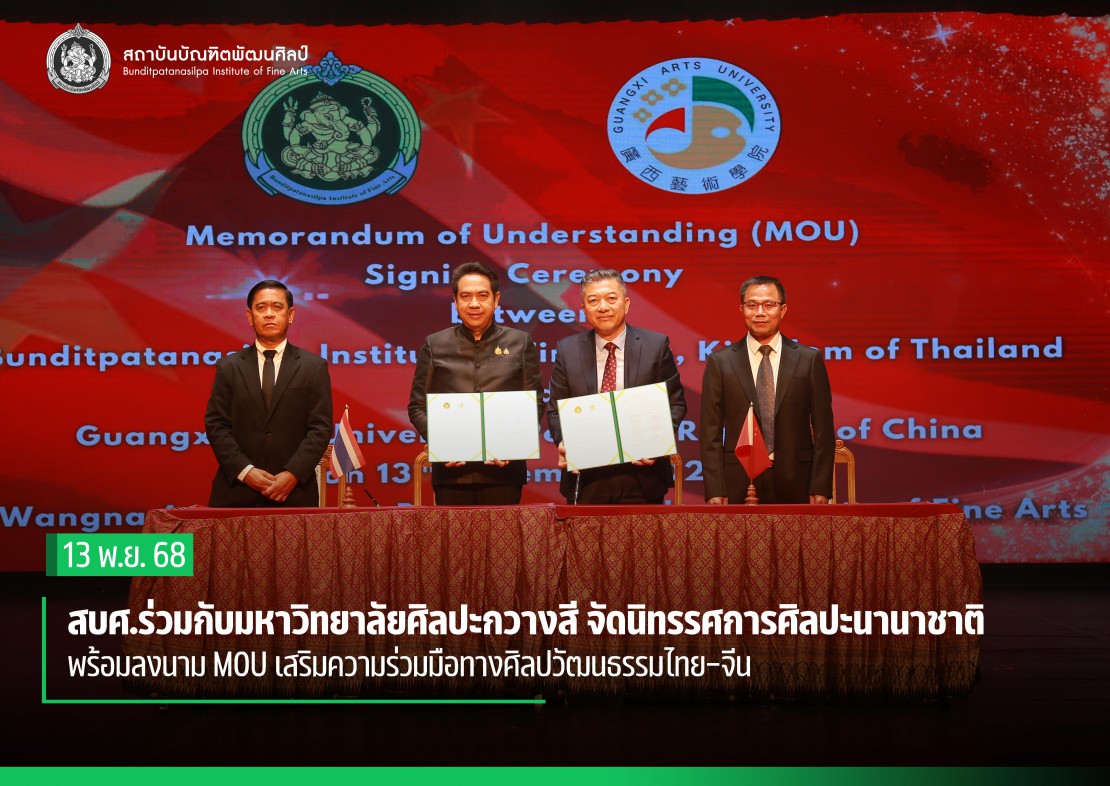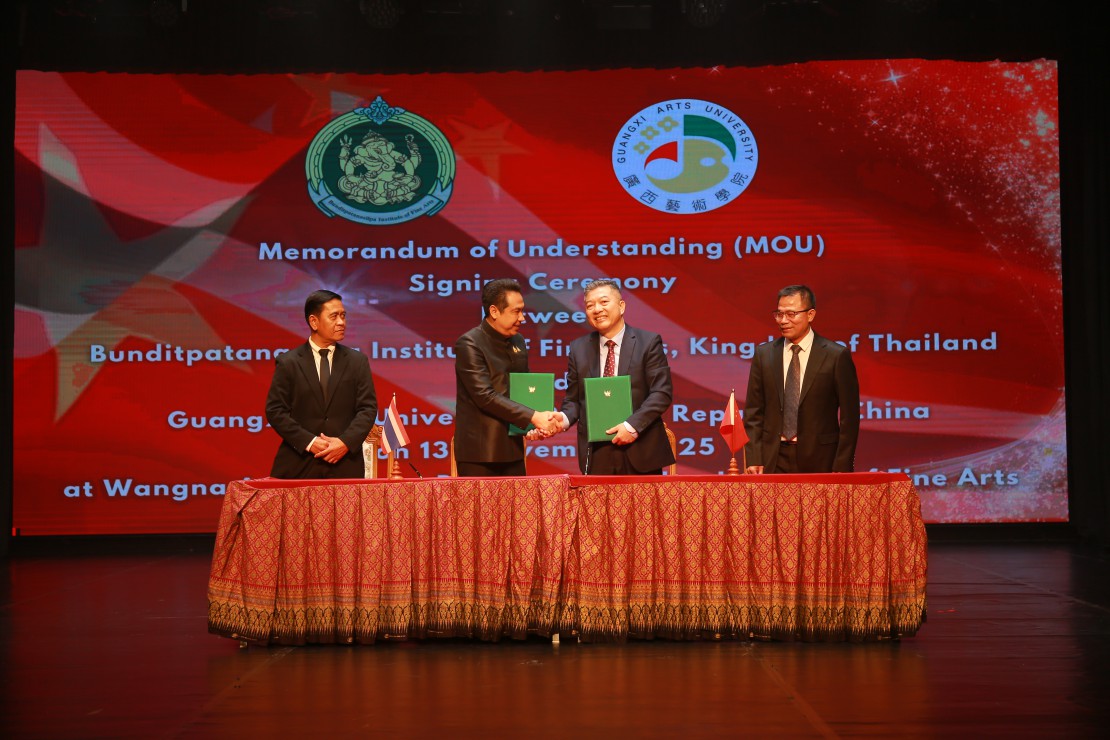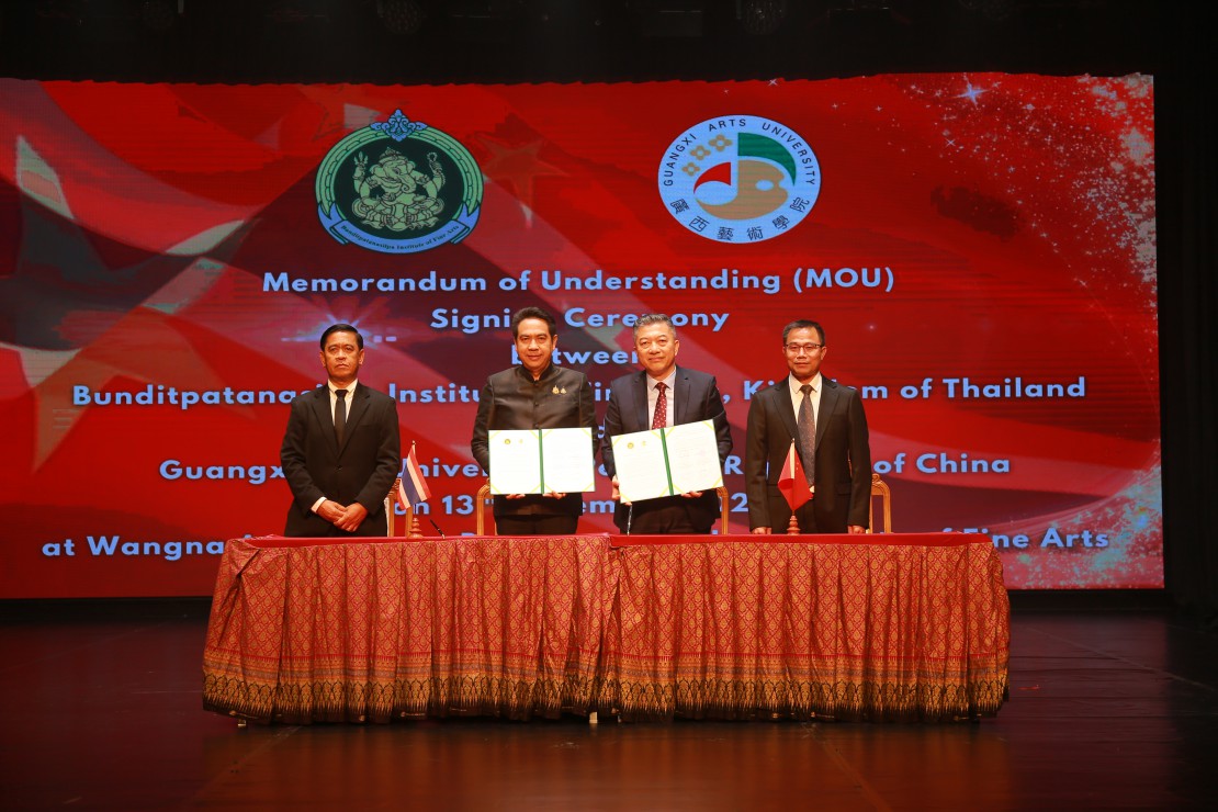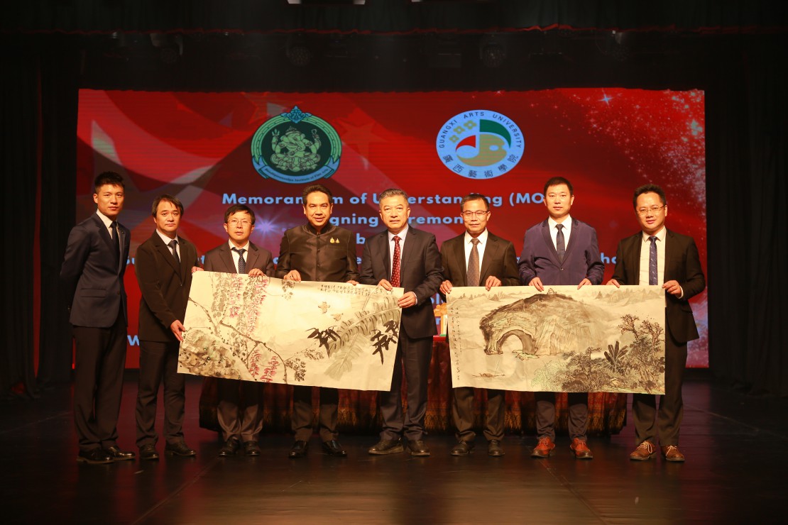 โอกาสนี้ ทั้งสองหน่วยงานได้ร่วมลงนามบันทึกความเข้าใจด้านศิลปวัฒนธรรม(MOU) ระหว่าง สถาบันบัณฑิตพัฒนศิลป์ โดย ผู้ช่วยศาสตราจารย์ ดร.สมเกียรติ ภูมิภักดิ์ อธิการบดี และ มหาวิทยาลัยศิลปะกวางสี โดย Professor Wei Junping อธิการบดี เพื่อส่งเสริมความสัมพันธ์ทางศิลปวัฒนธรรมระหว่างประเทศไทยและสาธารณรัฐประชาชนจีน ผ่านการแลกเปลี่ยนองค์ความรู้ ด้านศิลปกรรม การสร้างสรรค์ผลงานศิลปะร่วมกัน และส่งเสริมความเข้าใจอันดีระหว่างสองประเทศ