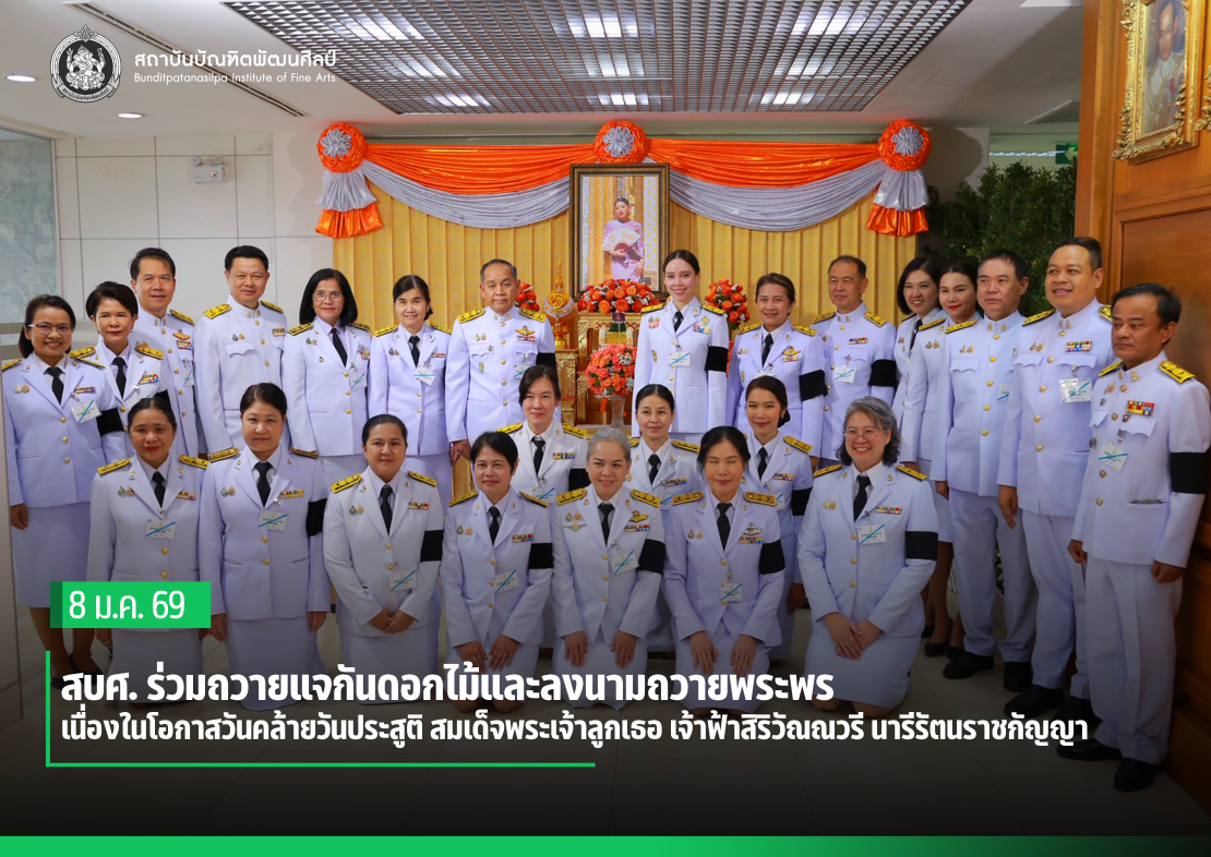 สถาบันบัณฑิตพัฒนศิลป์ โดย รองศาสตราจารย์ ดร.สมภพ เขียวมณี รองอธิการบดี ร่วมถวายแจกันดอกไม้และลงนามถวายพระพร เนื่องในโอกาสวันคล้ายวันประสูติ สมเด็จพระเจ้าลูกเธอ เจ้าฟ้าสิริวัณณวรี นารีรัตนราชกัญญา โดยมี นางสาวซาบีดา ไทยเศรษฐ์ รัฐมนตรีว่าการกระทรวงวัฒนธรรม นายประสพ เรียงเงิน ปลัดกระทรวงวัฒนธรรม คณะผู้บริหารกระทรวงวัฒนธรรม เข้าร่วมฯ ในวันที่ 8 มกราคม 2569 ณ วังศุโขทัย
