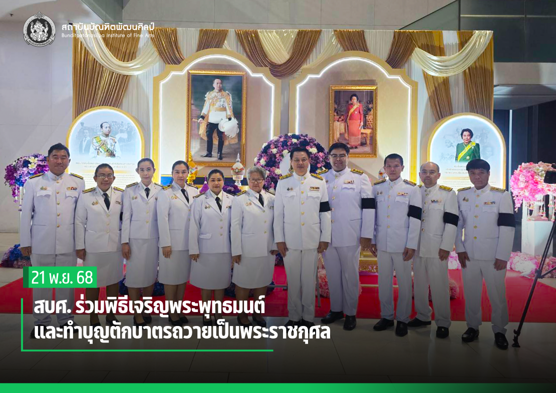 สถาบันบัณฑิตพัฒนศิลป์ โดย รองศาสตราจารย์ ดร.สมภพ เขียวมณี รองอธิการบดี พร้อมด้วยบุคลากรสำนักงานอธิการบดี เข้าร่วมพิธีเจริญพระพุทธมนต์และทำบุญตักบาตรถวายเป็นพระราชกุศลแด่พระบาทสมเด็จพระมงกุฎเกล้าเจ้าอยู่หัว เนื่องในโอกาสวันคล้ายวันสวรรคตครบ 100 ปี และถวายพระกุศลแด่สมเด็จพระเจ้าภคินีเธอ เจ้าฟ้าเพชรรัตนราชสุดา สิริโสภาพัณณวดี เนื่องในวันคล้ายวันประสูติครบ 100 ปี ในวันที่ 21 พฤศจิกายน 2568 ณ โถงชั้น 1 อาคารวัฒนธรรมวิศิษฏ์ กระทรวงวัฒนธรรม