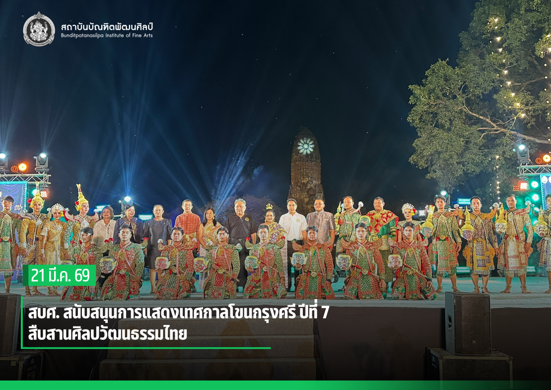 สถาบันบัณฑิตพัฒนศิลป์ จัดการแสดงโขนตอน “สำมนักขาก่อศึก - ศึกขร ทูษณ์ ตรีเศียร” นักแสดงจาก วิทยาลัยนาฏศิลปอ่างทอง ร่วมกับ วิทยาลัยนาฏศิลปสุพรรณบุรี และการแสดงนาฏศิลป์สี่ภาค จาก คณะศิลปนาฏดุริยางค์ ร่วมกับ วิทยาลัยนาฏศิลปจันทบุรี ในงานเทศกาลโขนกรุงศรี ปีที่ 7 สัปตศกศรี พระจักรีอวตาร เฉลิมฉลองเลขมหามงคลของพระราม อวตารปางที่ 7 แห่งพระนารายณ์ เมื่อวันที่ 20 มีนาคม 2569 ณ ลานข้างวัดพระราม อุทยานประวัติศาสตร์พระนครศรีอยุธยา จังหวัดพระนครศรีอยุธยา โดย ผู้ช่วยศาสตราจารย์ ดร. สมเกียรติ ภูมิภักดิ์ อธิการบดี ควบคุมการแสดงและอำนวยการแสดง โอกาสนี้ ได้รับเกียรติจาก ศาสตราจารย์พิเศษ ธงทอง จันทรางศุ นายกสภาสถาบันบัณฑิตพัฒนศิลป์ ร่วมรับชมการแสดงเพื่อสร้างขวัญและกำลังใจให้แก่นักแสดง